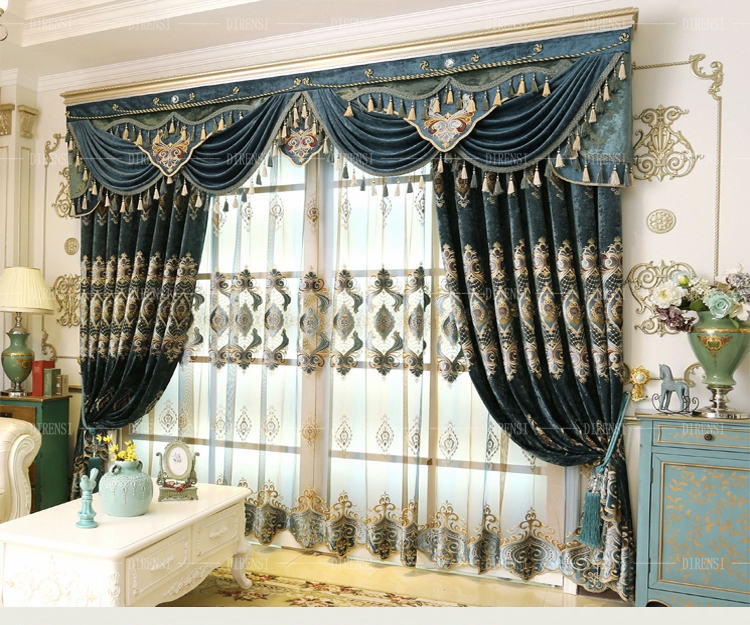 黛恩絲欧式カーテンは豪華客間の遮光スニールの刺繍の寝室の窓を設計して完成品の深藍の布の一メートルごとに注文します(無料のカーテンの頭と部品などを加工して別に計算します)。