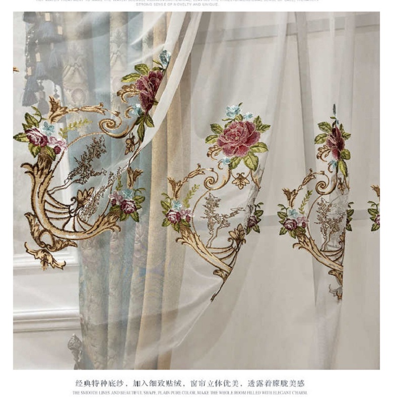 黛恩絲欧式アメリカンカーテンリビングルームの高級なシェニールの花の遮光カーテンの完成品の床に着いた窓の宝の青い布の一メートル(花の位置0.375、カーテンの頭と部品などは別に計算します)