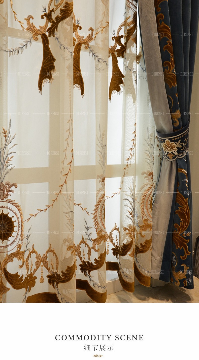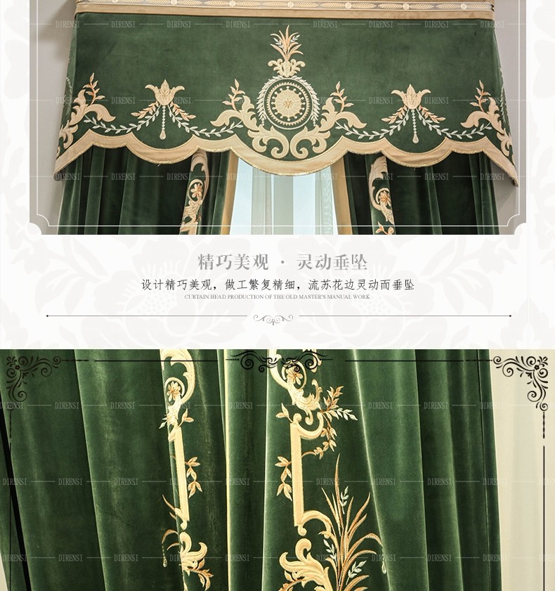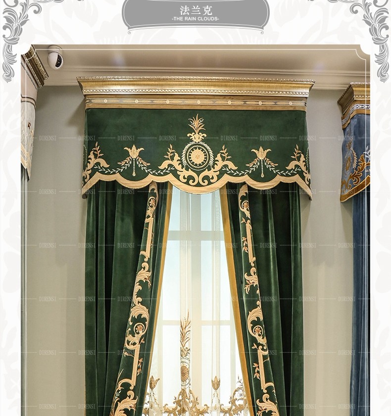 | 商品の名称 | 黛恩の糸のヨーロッパ式のカーテンの客間の寝室は簡単に近代的なアメリカ式の別荘の豪華な絨毯の刺繍のカーテンの完成品を注文して墨の緑色の純粋な色の布の一メートルごとに |