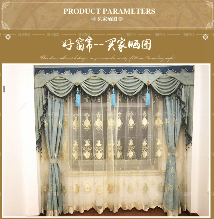 黛恩の糸の簡単なヨーロッパ式のカーテンのヨーロッパ式の客間は豪華に遮光して寝室の既製品の青い緑色の小さい清新な布芸の紗の一メートルごとに何メートルを要して何件を撮影しますか?