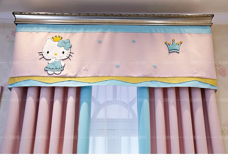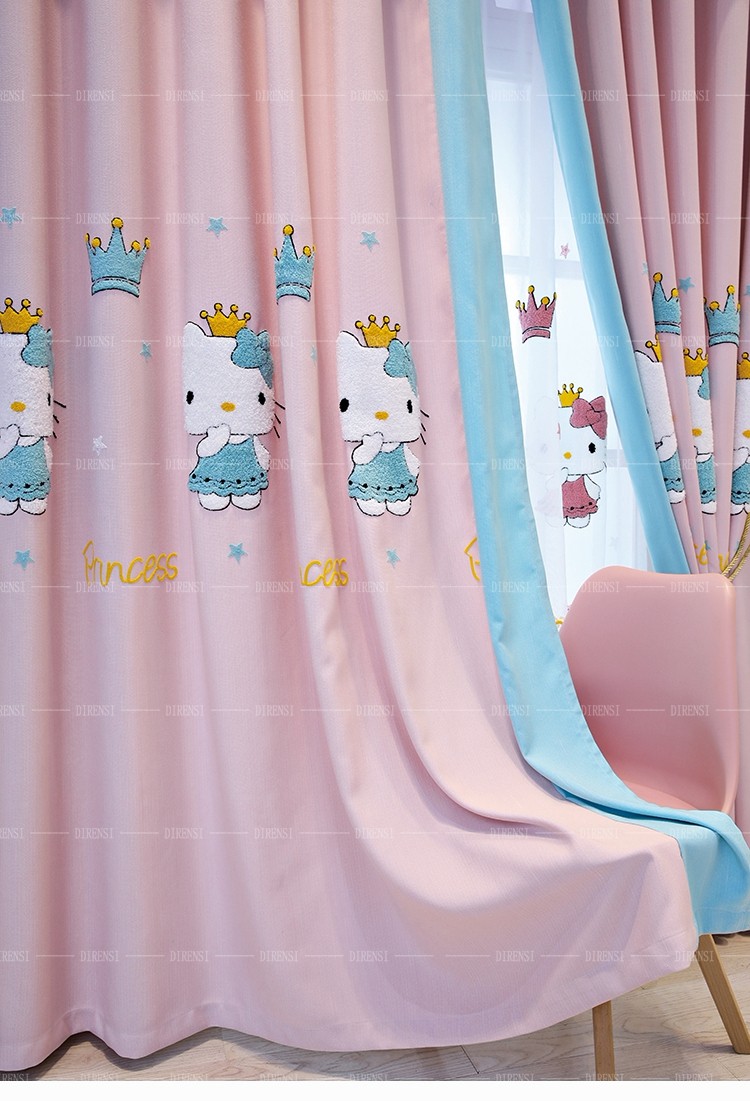 黛恩糸のアニメのカーテンは女の子の風の寝室の窓の子供部屋のカーテンの粉KT猫の綿麻の混紡の少女の粉のカーテンの遮光する布の完成品はピンク色を注文して、図のカーテンのようです。