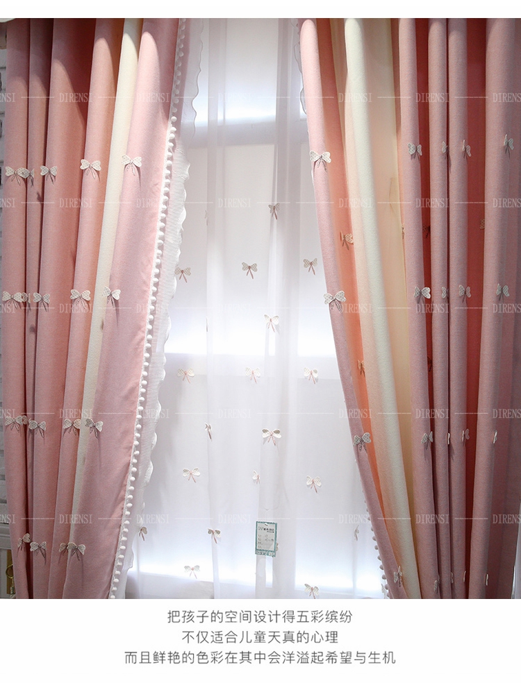 黛恩の糸のピンクの王女の風のカーテンの完成品の立体の刺繍は簡単に現代の韓国式の女の子の寝室の窓を揺らしてカーテンのカーテンを遮って金をつなぎ合わせます。(側がレースをつづり合わせて、カーテンの頭と部品などをつづり合わせます。)何メートルを要して何枚か撮りますか?