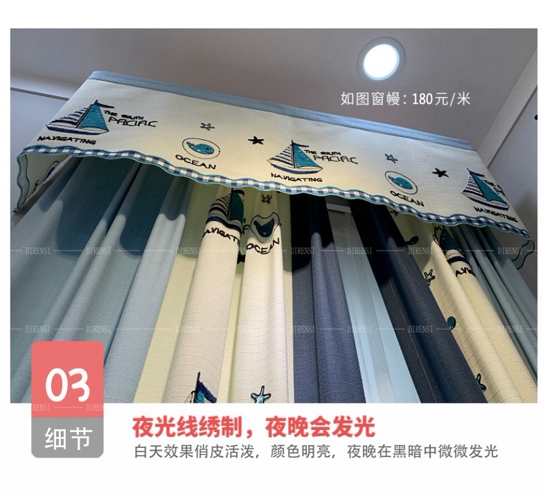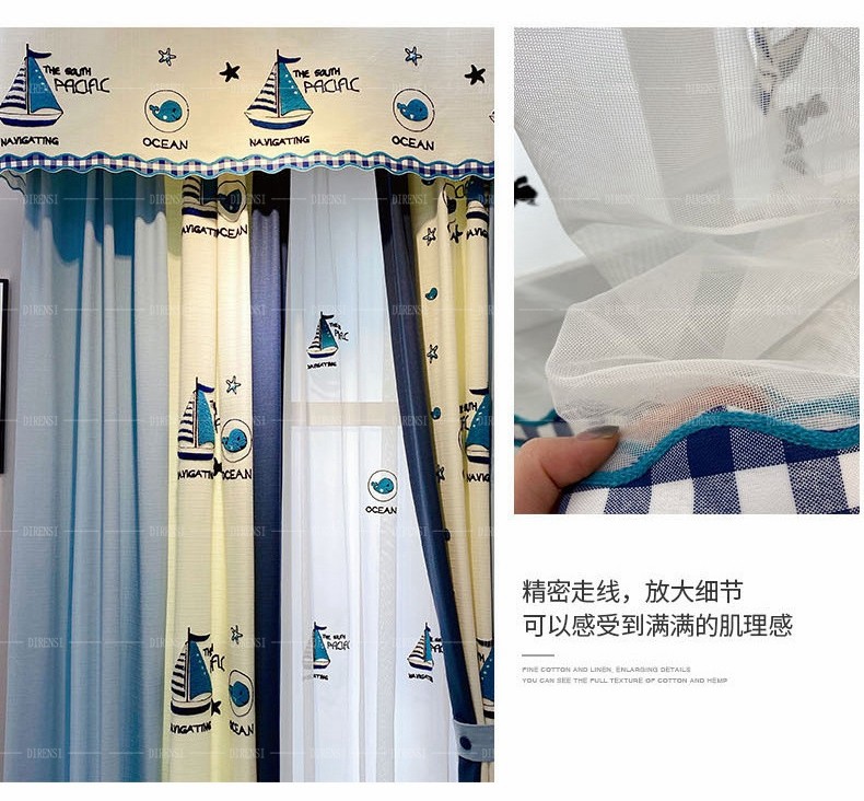 | 商品名称 | 黛恩糸子供部屋のカーテンは地中海風の男の子の寝室の遮光布の現代シンプルな英倫遮光漫画のカーテンに青い帆船の純色の布の幅1メートルを配置します(加工は無料です)。 |